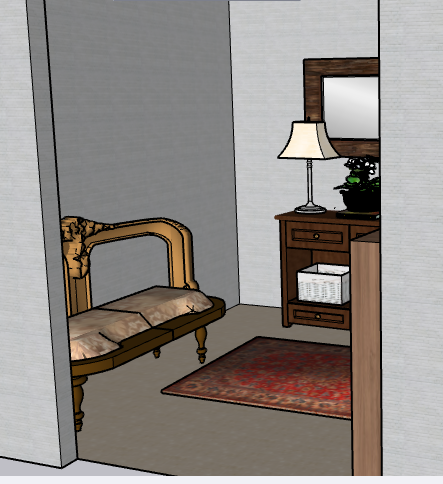 After finding all of your pieces for your space, make sure they are level with your axis! Use your Rotate tool!! Using your paint bucket, you can select your flooring, wall paint, and you can even change the colors of your pieces! Be sure to click File and Save. Have fun using Sketchup!